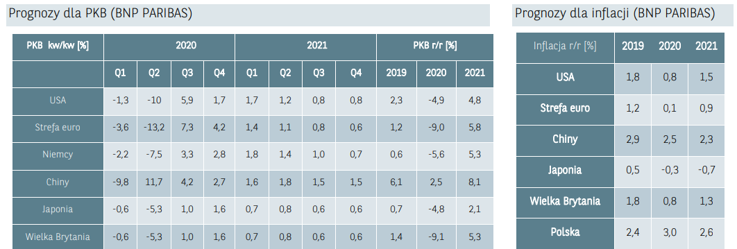 debata na temat wycofywania wprowadzonych programów pomocowych, a także ich kosztów oraz możliwości dalszej obsługi zadłużenia. Mając na uwadze powyższe dokonujemy jedynie nieznacznych zmian w naszych prognozach względem opublikowanych na początku czerwca. Nieznacznie podnosimy prognozy dla Stanów Zjednoczonych i Niemiec w związku z sprawnym działaniem organów państwowych w przeciwdziałaniu skutkom pandemii oraz jednocześnie obniżamy prognozy dla części krajów azjatyckich ze względu na dalsze rozprzestrzenianie się wirusa.