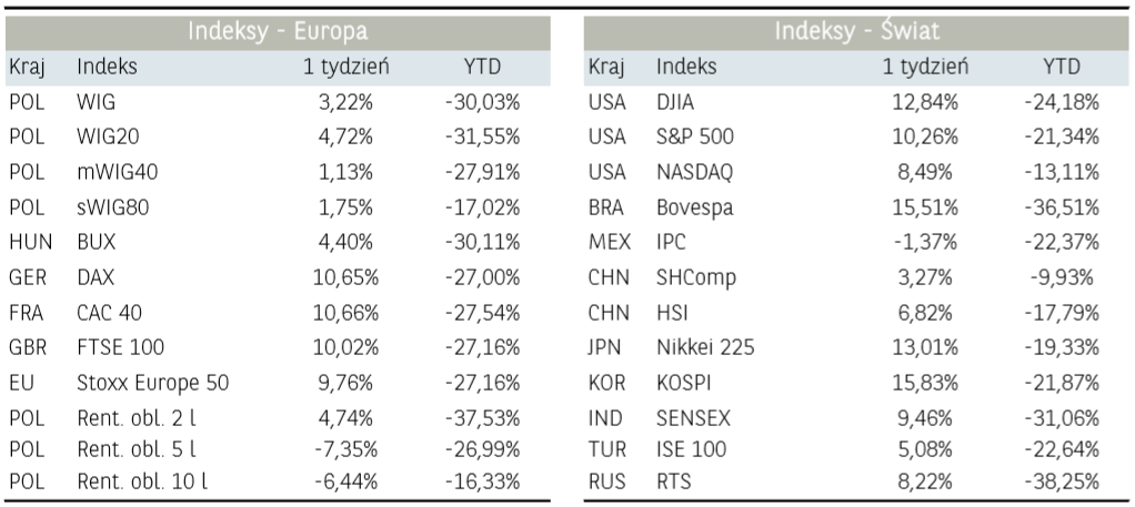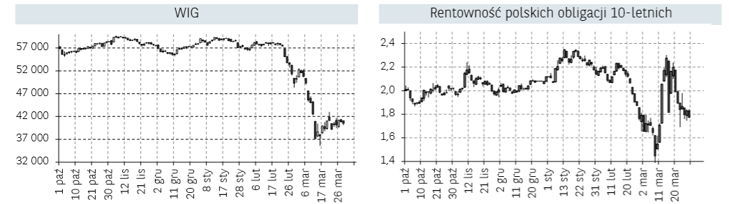 Za nami kolejny tydzień utrzymującej się wysokiej zmienności w notowaniach ryzykownych aktywów. W przypadku rynku akcji miniony tydzień można podzielić na dwa stany: spadków z obawy o rozprzestrzenianie się wirusa (poniedziałek oraz piątek) albo silnego odreagowania (środek tygodnia). Tak więc na początku tygodnia inwestorzy zwracali uwagę na przyspieszenie tempa wzrostu zakażeń koronawirusem w Stanach Zjednoczonych oraz wysokiej liczby zgonów z powodu epidemii we Włoszech, co doprowadziło do kilkuprocentowych spadków głównych indeksów. Nieoczekiwanie amerykańska Rezerwa Federalna ogłosiła w poniedziałek program wsparcia płynności pod postacią niegraniczonego zakupu obligacji celem utrzymania niskich kosztów finansowania zewnętrznego, co tym samym oznacza wprowadzenie nielimitowanego QE. Rynek nie zareagował jednak na kolejną dawkę płynności dostarczaną przez Fed. Dopiero wtorkowe informacje o osiągnięciu porozumienia w sprawie pakietu stymulacyjnego gospodarkę o wartości 2 bilionów dolarów w USA zmieniło podejście inwestorów. Spowodowało to silne zakupy akcji, a główne indeksy zyskiwały we wtorek blisko 10%. Szczególnie mocna sesja miała miejsce w Stanach Zjednoczonych, gdzie S&P zakończył notowania na ponad 9% „plusie”, Dow Jones zanotował największy, dzienny wzrost od 1933 roku (+11,3%). Wzmożonego popytu na instrumenty udziałowe nie przerwały mocno negatywne odczyty wskaźników PMI flash za marzec. Indeks Composite PMI dla Niemiec spadł z 50,7 w lutym, do 37,2 punktów, co jest najniższym poziomem od 2009 r. Z podobną reakcją na złe dane mieliśmy do czynienia w czwartek. Na zasadzie „sprzedawaj plotki, kupuj fakty” inwestorzy ocenili, iż spadki z ostatnich miesięcy zdyskontowały obecną sytuację gospodarczą, a złe dane ekonomiczne zwiększają szansę na kolejne programy pomocowe ze strony rządów i banków centralnych. Tak więc po opublikowaniu danych, które pokazały, że aż 3,3 mln osób (1% populacji USA) złożyło wnioski o zasiłek dla bezrobotnych, co jest najwyższą wartością w historii, kontrakty na S&P 500 zaczęły zyskiwać, a ostatecznie sam indeks zakończył dzień z wynikiem +6,24%. Wreszcie, po kilku seriach wzrostowych sesji i odreagowaniu na światowych giełdach, w piątek na rynkach przeważały negatywne nastroje, co mogło być związane z powrotem niepewności odnośnie utrzymania wysokiego tempa rozwoju pandemii koronowirusa. Inwestorzy mogli więc zamykać pozycje i ograniczać udział ryzykownych aktywów w portfelach przed weekendem obawiając się, że działania podejmowane przez rządy i banki centralne będą niewystarczające wobec negatywnych skutków gospodarczych obecnej epidemii. Ponadto w ostatnich dniach obserwowany jest gwałtowny wzrost zachorowań w USA, co rodzi obawy o stan tamtejszej służby zdrowia i konieczność zacieśnienia kwarantanny, która negatywnie wpłynie na największą gospodarkę na świecie. Giełdom nie pomogły także informacje ze strony krajów G-20, które łącznie wesprą globalną gospodarkę w kwocie ponad 5 bilionów USD, bez wpływu pozostały także informacje o kolejnych działaniach banków centralnych (obniżka stóp procentowych w Kanadzie oraz Indiach).