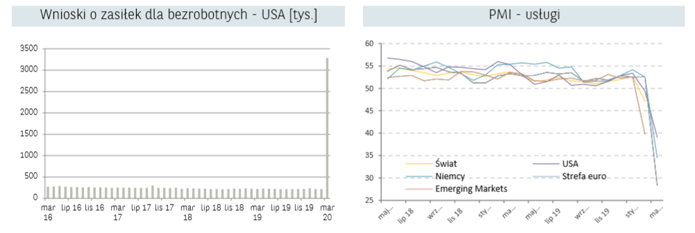 Z punktu widzenia danych makroekonomicznych to w ubiegłym tygodniu najważniejszy był bezprecedensowy odczyt wzrostu liczby osób ubiegających się o świadczenia dla bezrobotnych w USA. W poprzednim tygodniu ponad 3,28 mln amerykanów złożyło wniosek o zasiłek. Niespotykany od czasu rozpoczęcia publikacji wskaźnika wzrost podkreśla skalę „zniszczeń” gospodarczych spowodowanych pandemią koronawirusa. W ostatnich tygodniach liczba wniosków wahała się w okolicach 200-300 tys. Nieprzerwany optymizm na rynku akcji może sugerować, że inwestorzy spodziewali się w rzeczywistości o wiele gorszych wyników, bądź uważają że podejmowane obecnie działania okażą się skutecznym wsparciem dla firm.