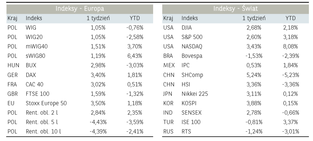 Pomimo nowych informacji odnośnie kolejnej fali rozprzestrzeniania się koronowirusa na świecie, ubiegły tydzień przyniósł odreagowanie na bazowych rynkach akcji. S&P500 zyskał ponad 3% wyznaczając nowe, historyczne szczyty na poziomie bliskim 3 350 punktów. Sytuację wspiera tam między innymi, trwający sezon wynikowy. 340 spółek, które zaraportowały dotychczas wyniki odnotowało ponad 3% wzrostu przychodów i prawie 0,5% wzrostu zysków r/r. Trzeba pamiętać, że jeszcze pod koniec 2019 roku konsensus rynkowy przewidywał spadek wyników w konwencji r/r. Największe wzrosty wyników odnotowały spółki z sektora opieki zdrowotnej, telekomunikacji i użyteczności publicznej. Negatywną zmianę wyników wykazały spółki cykliczne z sektora wydobywczego i chemicznego. Wzrosty na rynkach nie ominęły również Europy Zachodniej. Niemiecki DAX wzrósł o 4,1% i znajduje się obecnie blisko strefy 13600 punktów, tj. historycznych szczytów. W najbliższej perspektywie, kluczowa będzie kwestia ustabilizowania się sytuacji w Państwie Środka, a w szczególności wznowienia działalności przez chińskie fabryki, tak aby nie doszło do długotrwałego przerwania łańcucha dostaw produktów.