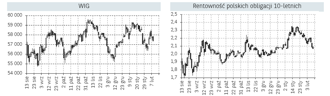 - W bieżącym tygodniu najważniejsze będą odczyty makroekonomiczne publikowane w piątek (14 lutego), czyli dane o wzroście PKB w IV kwartale w Polsce oraz Niemczech. Ponadto podana zostanie inflacja CPI z kraju za styczeń. Dzień wcześniej analogiczne dane o inflacji podadzą Niemcy.