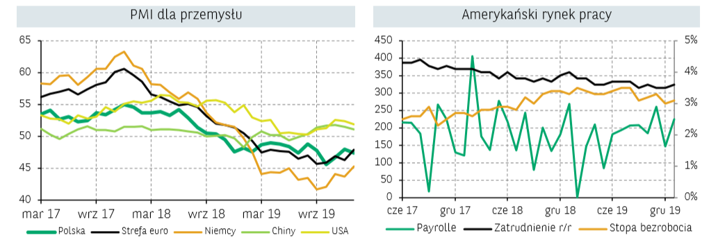 Dobre dane z rynku pracy sygnalizowane były wcześniej przez podany w środę raport ADP, który wskazał, że w styczniu 2020 r. w amerykańskiej gospodarce w sektorze prywatnym poza rolnictwem utworzonych zostało 291 tys. miejsc pracy (oczekiwano 157 tys.). Lepsze od oczekiwań były ponadto dane ISM z przemysłu USA. Wskaźnik ten wzrósł w styczniu do 50,9 z 48,5 pkt w grudniu i sugeruje poprawę sytuacji w przemyśle USA na początku tego roku. Analogiczny odczyt ISM dla usług również okazał solidną sytuację w amerykańskiej gospodarce. Wskaźnik wyniósł 55,5 pkt. wobec 55,0 oczekiwań i 54,9 pkt. odczytu grudniowego. Na dane te wpływu nie miała jednak prawdopodobnie jeszcze epidemia w Chinach. Możliwe jest więc, że jego lutowe wskazanie może być ponownie słabsze.