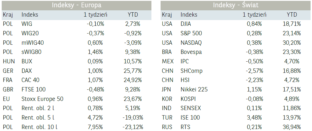 - Globalny optymizm nie ominął tym razem również warszawskiego parkietu. Indeks polskich blue chipów zamknął tydzień 2,7% na plusie. Nieco słabiej radziły sobie średnie i mniejsze spółki osiągając w ubiegłym tygodniu stopy zwrotu