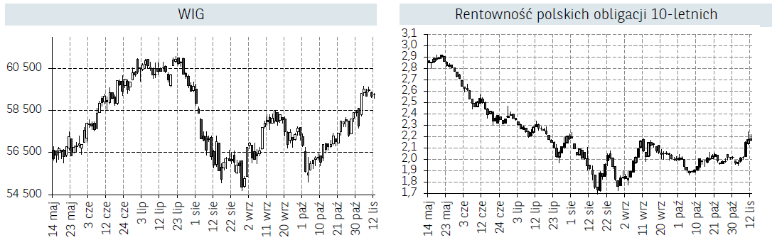 w relacjach amerykańsko chińskich, zapoczątkowane przez doradcę prezydenta Trumpa do spraw handlowych Petera Navaro, który oznajmił, iż póki co nie ma zgody na cofnięcie ceł, a taką decyzję może podjąć osobiście tylko prezydent. Dodatkowym źródłem niepewności stała się informacja o możliwym przesunięciu podpisania wstępnego porozumienia na grudzień. Negatywne doniesienia mimo wszystko nie spowodowały, jak to bywało wcześniej gwałtownej przeceny na światowych rynkach akcji, niemniej jednak dalszy wzrost został przystopowany, a wybór kierunku w którym będą podążać będą światowe parkiety
