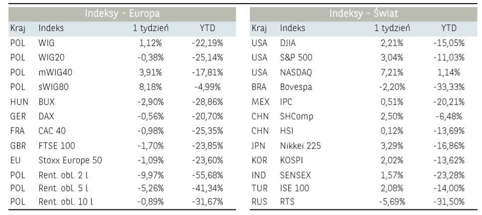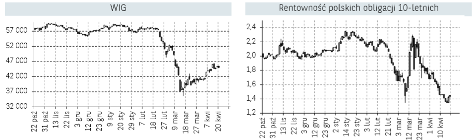 Poświąteczny tydzień na rynkach był kolejnym pozytywnym dla inwestorów skupionych na rynkach akcji. Pomimo trwającej epidemii koronawirusa, wypłaszanie się krzywej zachorowań w wielu krajach sprawiło, iż wśród kupujących pojawił się widoczny optymizm. Ponadto poszczególne kraje, w tym Polska, zaczynają przedstawiać plan stopniowego wychodzenia z zamknięcia gospodarek. Chociaż nowa rzeczywistość będzie znacząco odbiegać od tego, co było normalnością zaledwie dwa miesiące temu, to nadzieja na aktywizację działalności gospodarczej jest obecnie jednak głównym motorem dla wzrostu cen akcji na parkietach. W obliczu trwającej pandemii swoją przewagę nad pozostałymi sektorami przypieczętowały spółki z sektora technologicznego. Przez wielu w ostatnich latach wymieniane, jako znacząco przewartościowane, obecnie wymieniane są jako liderzy wśród spółek, które najłagodniej przejdą okres spowolnienia gospodarczego. Odzwierciedlają to notowania indeksu Nasdaq 100, czyli indeksu największych spółek technologicznych, który w ubiegłym tygodniu zyskał aż 7,21% i tym samym od początku roku wzrósł 1,14%. Dla porównania S&P 500, agregujący największe 500 amerykańskich spółek z wielu sektorów, od początku roku wciąż traci 11,03%. W powyższym otoczeniu, jak to zazwyczaj ma miejsce, słabością charakteryzuje się warszawski parkiet, który od początku roku jest o 23,19% niżej niż na koniec 2019 roku, niemniej jednak jest to tylko ok. 2,5 pp. gorszy wynik od niemieckiego DAX30. Na warszawskim parkiecie w ostatnim tygodniu ciążyły przede wszystkim notowania banków, których wyceny znajdują się pod presją po kolejnym cięciu stóp procentowych przez Radę Polityki Pieniężnej. Dobrze natomiast radzi sobie energetyka, producenci gier oraz spółki z indeksu WIG-Leki.