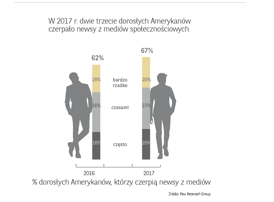 Szybko okazało się jednak, że przestrzeń powstałą po demontażu dotychczasowego ładu wypełniają zjawiska bynajmniej nie budzące zachwytu wśród dominującej części zachodniej opinii publicznej. Po pierwsze, ustanowione przez gigantów technologicznych zasady (w tym przede wszystkim algorytmy) sprzyjają pozyskiwaniu przez obywateli raczej bardziej sensacyjnych, niż wiarygodnych informacji. Jak ujawnił były pracownik YouTube w artykule dla brytyjskiego Guardiana², algorytm zarządzający rekomendacjami dla użytkowników tego serwisu (nota bene będący drugą największą na świecie wyszukiwarką internetową) jest zbudowany w sposób promujący kontrowersyjne i polaryzujące treści.