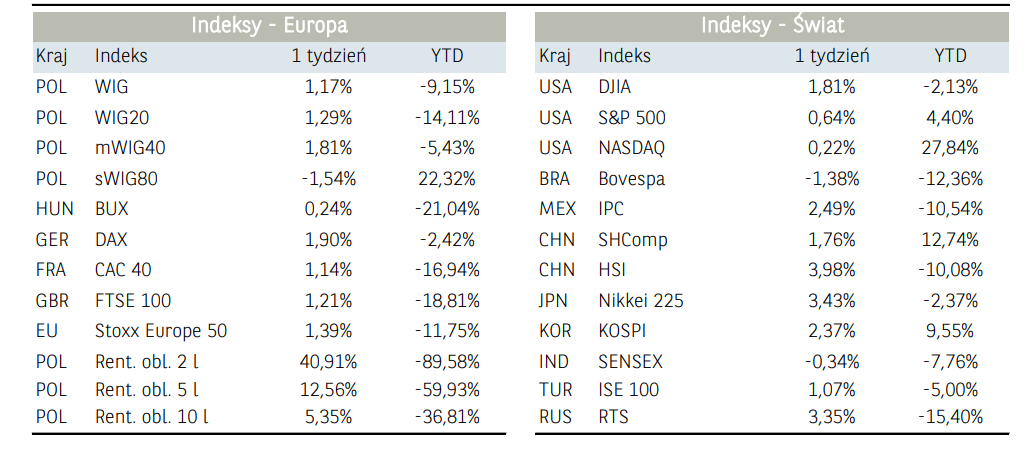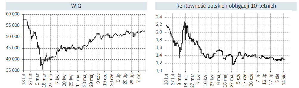 Początek, jak i koniec zeszłego tygodnia charakteryzował się neutralnym nastawieniem uczestników rynku akcji. Inwestorom ciążyła przede wszystkim niepewność w związku z pandemią koronawirusa, którą dodatkowo nasilają kolejne ekonomiczno-polityczne starcia na linii WaszyngtonPekin. W handlu nie pomagały nawet doniesienia z USA, gdzie Prezydent Trump sygnował w poprzedni weekend rozporządzenie wykonawcze, niewymagające zgody Kongresu, w którym między innymi przedłużono program wsparcia dla Amerykanów w formie cotygodniowej wypłaty zasiłków. Sytuacja uległa chwilowo zmianie w połowie tygodnia, gdzie większość europejskich rynków akcji (w tym Polski) notowało wzrosty. W środę wyraźne zwyżki zaliczyły również indeksy za oceanem, a indeks S&P500 zbliżył się do osiągniecia historycznych maksimów. Wsparciem dla inwestorów okazały się doniesienia, jakoby Donald Trump zaproponował obniżenie podatków dochodowych dla firm.