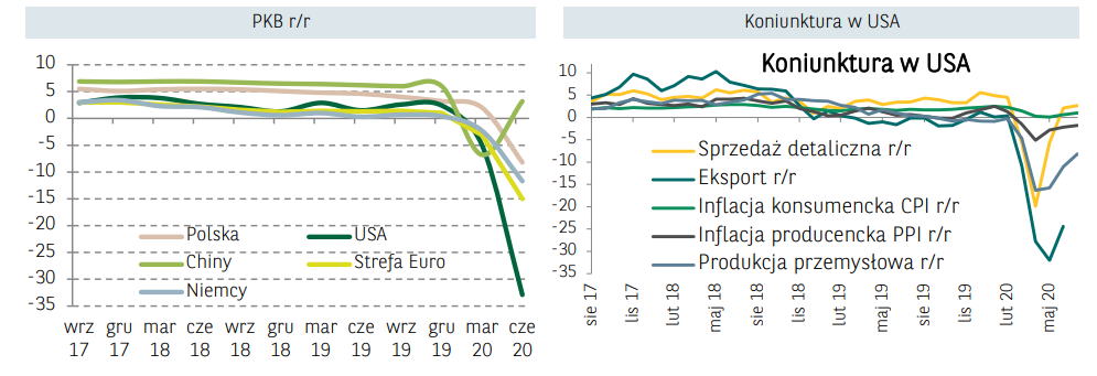W piątek GUS opublikował wstępne dane o wzroście gospodarczym w Polsce w drugim kwartale. W okresie kwiecień–czerwiec PKB w Polsce spadł o 8.2% r/r wobec wzrostu o 2.0% r/r w pierwszym kwartale. Dane okazały się w dużej mierze zgodne z naszą prognozą spadku o 7-8% i lepsze niż konsensus zakładający spadek o 9% r/r, a także silniejsze niż najnowsza projekcja NBP, zakładająca spadek o 10.6% r/r w drugim kwartale. Szczegółowe dane, zawierające rozbicie na poszczególne komponenty Rachunków Narodowych GUS opublikuje 31 sierpnia. Na