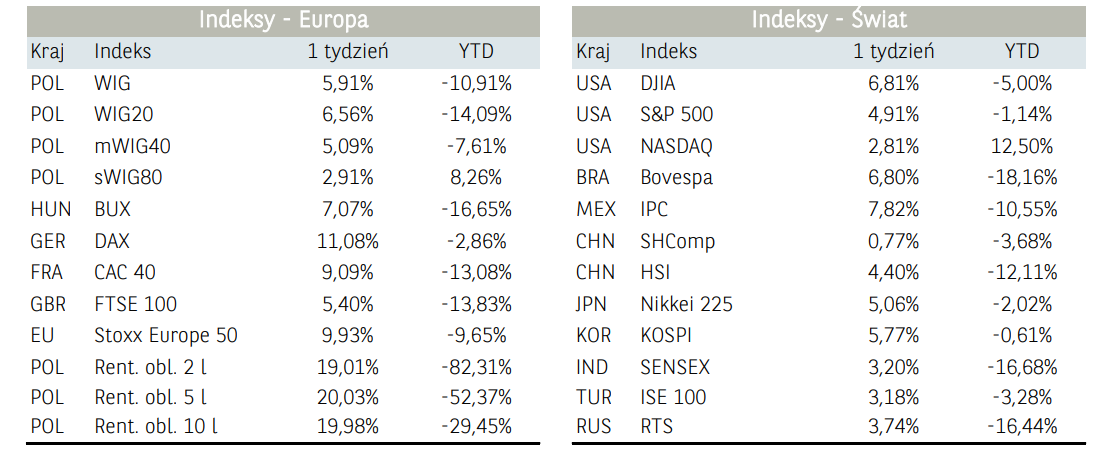 - Miniony tydzień na rynkach akcji zakończył się spektakularnymi wzrostami. Większość kluczowych indeksów notowały wysokie jednocyfrowe zmiany a w przypadku niemieckiego DAX, czy francuskiego CAC40 okazały się one nawet dwucyfrowe. Mocnym wsparciem dla rynków akcji, w szczególności w Europie okazało się posiedzenie Europejskiego Banku Centralnego, na którym choć pozostawiono stopy procentowe bez zmian, to podwyższono o kwotę 600 mld EUR, czyli więcej niż oczekiwano, program awaryjnego skupu aktywów w ramach programu PEPP (Pandemic Emergency Purchase Programme).
