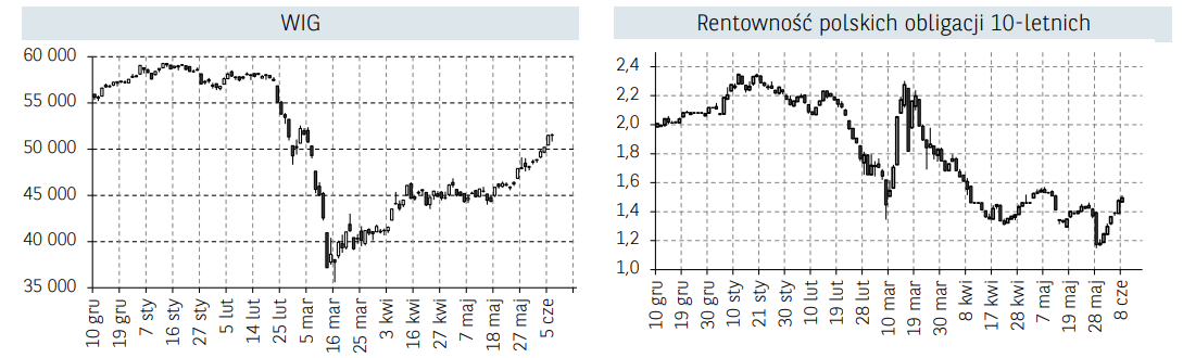 Mocnym wsparciem dla rynków akcji, w szczególności w Europie okazało się posiedzenie Europejskiego Banku Centralnego, na którym choć pozostawiono stopy procentowe bez zmian, to podwyższono o kwotę 600 mld EUR, czyli więcej niż oczekiwano, program awaryjnego skupu aktywów w ramach programu PEPP (Pandemic Emergency Purchase Programme). Wsparciem dla inwestorów były również zaskakująco dobre dane z amerykańskiego rynku pracy za maj. Pozytywne nastroje na rynku amerykańskich przełożyły się na nowe historyczne szczyty indeksu Nasdaq100. Sam indeks zachowywał jednak relatywną słabość w stosunku do S&P500. Powyższe, może świadczyć o zainteresowaniu inwestorów bardziej cyklicznymi spółkami takimi jak chociażby przedstawiciele sektora przemysłowego i energetycznego, którzy od początku roku traciły relatywnie więcej na wartości niż np. emitenci z branży informatycznej.