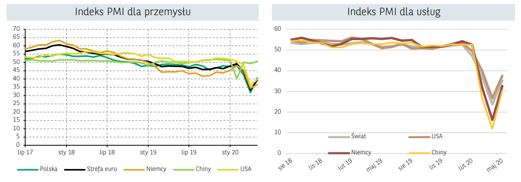 W zeszły poniedziałek poznaliśmy odczyty wskaźników wyprzedzających (PMI) dla przemysłu za miniony miesiąc. W Niemczech, wskaźnik wzrósł do 36.6 pkt. w maju z 34.5 w kwietniu. W Polsce, PMI wzrósł do 40.6 punktów, tj. znacznie powyżej oczekiwań rynku, które zakładały jego wzrost do 35.6 punktów z rekordowo niskiego poziomu w kwietniu. Odbicie wskaźnika PMI sugeruje wyhamowanie spadku produkcji przemysłu przetwórczego do 10-15% r/r w maju, zwłaszcza biorąc pod uwagę wolniejszy niż w kwietniu spadek bieżącej produkcji. W ślad za luzowaniem ograniczeń nakładanych na gospodarki europejskie, w tym Polskę, rosną nadzieje na dalszą poprawę wskaźnika PMI.