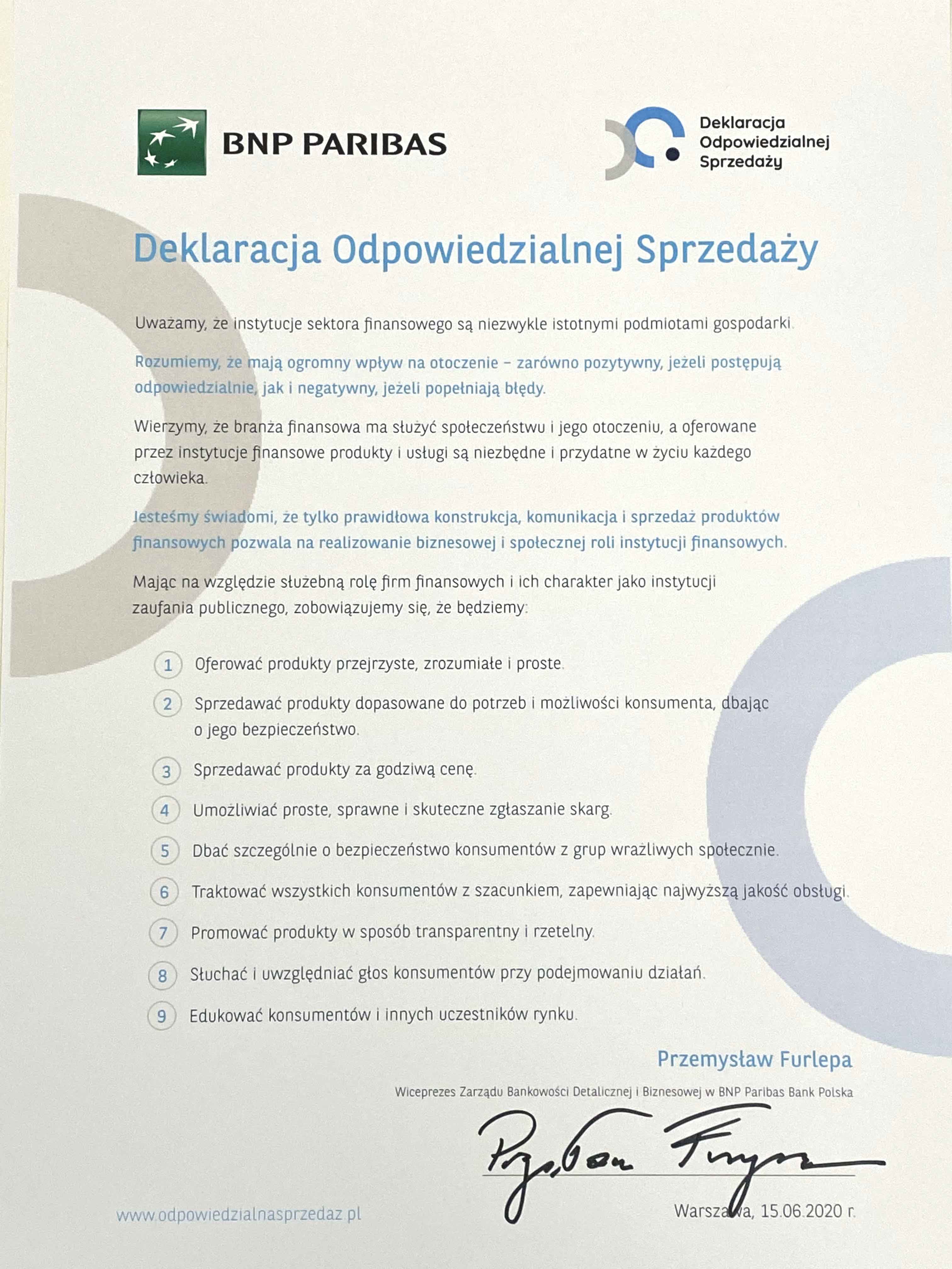 „Tytuł Sygnatariusza Deklaracji Odpowiedzialnej Sprzedaży to dla nas ważne zobowiązanie, które wyznacza kierunek ciągłego doskonalenia naszego sposobu działania, procesów i modelów obsługi. Jesteśmy świadomi wyzwań, które powstają wraz z każdym nowym produktem i każdą nową relacją. Nasze podejście jest oparte na odpowiedzialności i zaangażowaniu. Z uważnością i wrażliwością podchodzimy do spraw Klientów i każdego dnia się uczymy identyfikując to, co wymaga poprawy i utrwalając to, co robimy dobrze. Deklaracja Odpowiedzialnej Sprzedaży to ważny krok na ścieżce rozwoju, którą podążamy.”