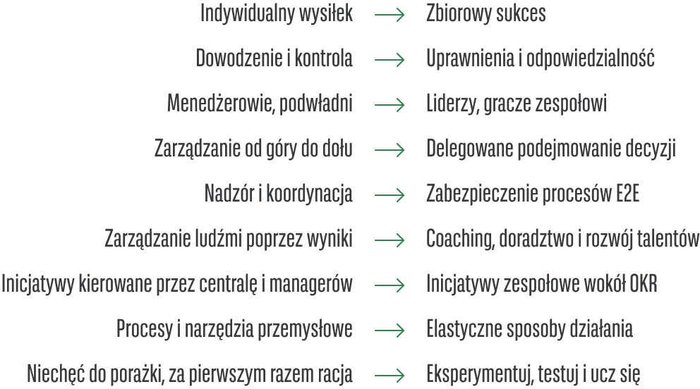 Elastyczna i współpracująca organizacja , oparta na „kręgach” ( zespołach zespołów ), aby móc pracować nad OKR