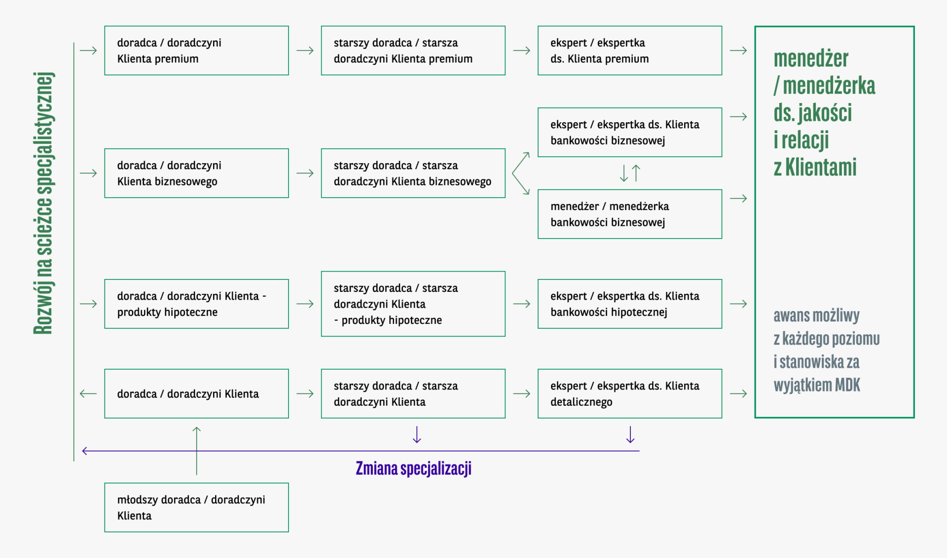 Awans stanowiskowy odbywa sie stopniowo. Spełnienie kryteriów awansu na eksperta / ekspertkę przez doradcę / doradczynię Klienta nie powoduje ominięcia szczebla awansu na st. doradcę / st. doradczynię Klienta.