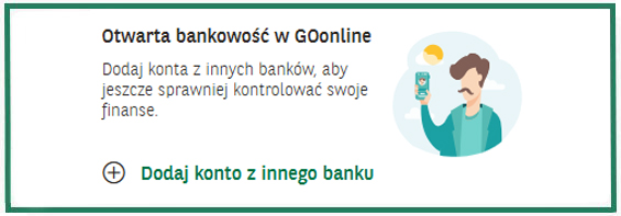 Otwarta bankowość pozwala na podgląd w bankowości internetowej GOonline kont z wybranych innych banków. Usługa dostępu do informacji o rachunkach w innych bankach - AIS (z ang. Account Information Service) opiera się na ustawie o usługach płatniczych, która implementuje unijną dyrektywę PSD2. Zgodnie z nią banki, za Twoją zgodą, zobowiązane są przekazać informacje o Twoich rachunkach dostępnych online podmiotom zewnętrznym (w tym innym bankom czy instytucjom płatniczym).