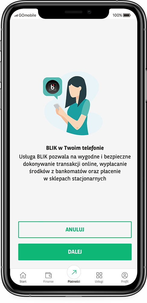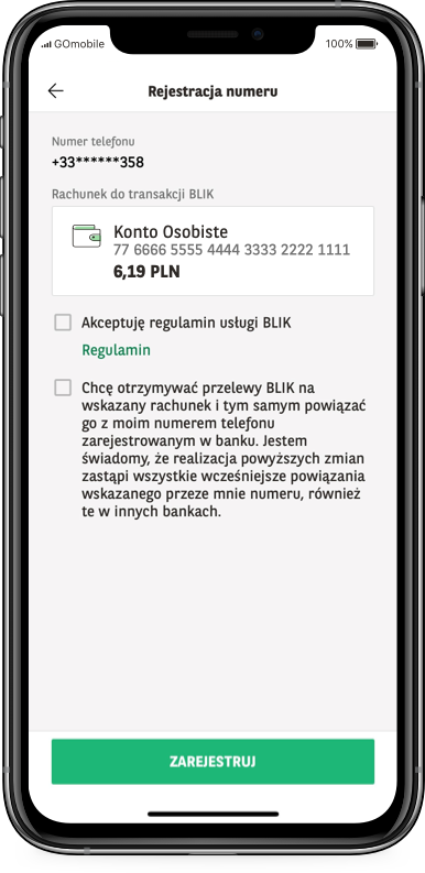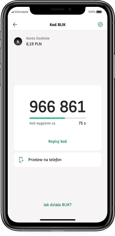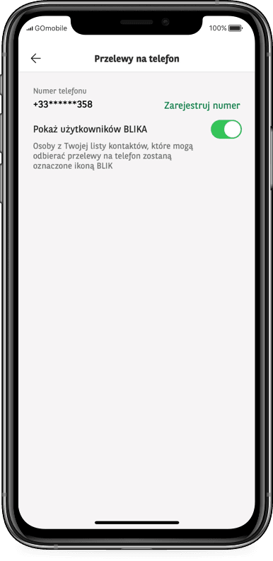 Przy zlecaniu przelewu na telefon możesz wybrać odbiorcę bezpośrednio z listy kontaktów w telefonie. Aby to zrobić, udostępnij aplikacji GOmobile listę swoich kontaktów - przy komunikacie „Sprawdzaj, kto z Twojej listy kontaktów może odbierać przelewy na telefon” wybierz Włącz lub w Ustawieniach BLIK wybierz opcję Pokaż użytkowników BLIKA.