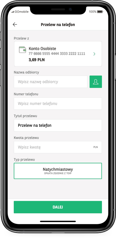 - dzienna liczba przelewów na telefon: 30 sztuk