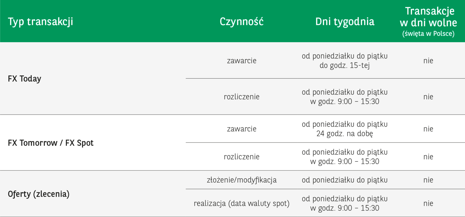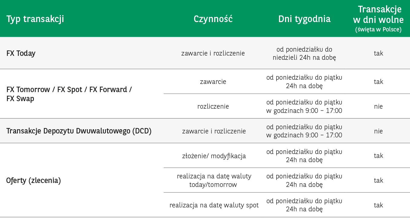 - 24h/7 dni w tygodniu: transakcje TODAY mogą być zawierane codziennie 24 godziny na dobę, z wyjątkiem dni ustawowo wolnych od pracy (innych niż niedziela). Szczegółowy wykaz godzin zawarcia oraz realizacji transakcji znajduje się poniżej