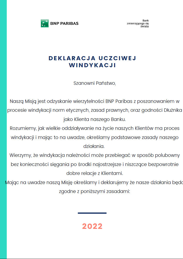 - Deklaracja Uczciwej Windykacji jest dokumentem, który powstał z inicjatywy samych pracowników Banku, zajmujących się windykacją.