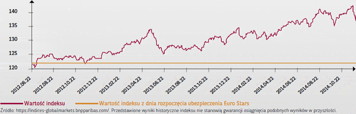 EuroStars III jest produktem strukturyzowanym w formie grupowego ubezpieczenia na życie z ubezpieczeniowym funduszem kapitałowym, przygotowanym przez Towarzystwo Ubezpieczeń na Życie „Warta” S.A. Oferta jest skierowana do osób fizycznych, pełnoletnich (mających ukończony 18. rok życia), które nie ukończyły 80. roku życia, gotowych na ulokowanie środków w pełnym wymiarze czasu trwania ubezpieczenia – 2,5 roku (tj. do 06.09.2017). Ubezpieczony może zrezygnować z przystąpienia do umowy ubezpieczenia lub wystąpić z umowy ubezpieczenia poprzez dokonanie wcześniejszego wykupu. Wcześniejszy wykup złożony w okresie od 05.03.2015 r. do 06.09.2017 r. związany jest z brakiem 95% ochrony kapitału i wiąże się z koniecznością poniesienia opłaty dystrybucyjnej (pobieranej przy wykupie), której wartość wynosi w zależności od momentu rezygnacji od 0,73% do 3,63% wartości składki. Warunkiem przystąpienia do ubezpieczenia jest posiadanie umowy rachunku bankowego w zakresie lokat terminowych. Szczegółowe warunki, dotyczące zakresu ubezpieczenia, wyłączenia i ograniczenia odpowiedzialności ubezpieczyciela, naliczania i wypłaty świadczeń, wysokości oraz sposobu pobierania opłat, wyceny jednostek uczestnictwa oraz charakterystyki ubezpieczeniowego funduszu kapitałowego, znajdują się w Szczegółowych Warunkach Ubezpieczenia: Grupowe ubezpieczenie na życie z ubezpieczeniowym funduszem kapitałowym EuroStars III, dostępnych w oddziałach Banku. Dla świadczeń wypłacanych przez TUnŻ „Warta” S.A., wynikających z umowy ubezpieczenia, zastosowane zostaną właściwe przepisy, z ustawy o podatku dochodowym od osób fizycznych lub ustawy o podatku dochodowym od osób prawnych. Bank jest ubezpieczającym, który umożliwia przystąpienie do ubezpieczenia na podstawie umowy ubezpieczenia pomiędzy bankiem a ubezpieczycielem. Produkt EuroStars III został przygotowany i jest oferowany zgodnie z zasadami III Rekomendacji dobrych praktyk na polskim rynku bancassurance w zakresie ubezpieczeń z elementem inwestycyjnym lub oszczędnościowym, opracowanej we współpracy z Polską Izbą Ubezpieczeń i zatwierdzonej przez Zarząd Związku Banków Polskich. Niniejszy materiał został opracowany jedynie do celów informacyjnych i nie stanowi oferty kupna lub sprzedaży, porady inwestycyjnej ani porady stanowiącej czynność doradztwa podatkowego. Wpłacona składka nie podlega ochronie Bankowego Funduszu Gwarancyjnego. Zgodnie z ogólną zasadą, związaną z lokowaniem środków w produkty inwestycyjne, zalecana jest dywersyfikacja dokonywanych inwestycji. EuroStars III w stosowanej polityce inwestycyjnej dąży do zapewnienia osiągnięcia celu inwestycyjnego, jakim jest ochrona 95% początkowej wartości jednostki uczestnictwa funduszu oraz osiągnięcie stopy zwrotu uzależnionej od zmian wartości indeksu BNP Paribas Fd – Flexible Fund Stars Index (EUR). Ani BNP Paribas Bank Polska S.A., ani Ubezpieczyciel nie gwarantują osiągnięcia celu inwestycyjnego, o którym mowa powyżej. Indeks wykorzystany w produkcie EuroStars III należy do BNP Paribas, gdzie BNP Paribas jest sponsorem indeksu („Sponsor Indeksu”). Sponsor Indeksu nie jest zaangażowany w sprzedaż ani promocję niniejszego produktu, nie przyjmuje też żadnej odpowiedzialności związanej z takimi produktami lub za wykorzystanie Indeksu w jakimkolwiek innym celu lub za jakiekolwiek straty związane z Indeksem lub wynikłe z informacji zawartych w niniejszym dokumencie. Ponadto Sponsor Indeksu i Agent Kalkulacyjny Indeksu informują, że (i) nie składają żadnego oświadczenia co do wyników, które mogą być uzyskane z wykorzystania Indeksu lub poziomów, na jakich Indeks się znajduje lub może się znajdować w konkretnej dacie, (ii) nie ma żadnego obowiązku utrzymywania obliczeń lub publikowania Indeksu oraz (iii) nie gwarantuje dokładności ani kompletności Indeksu lub zastosowanych metod obliczeniowych.