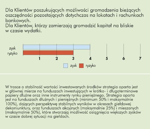 - Strategia Niebieska Plus (umiarkowane ryzyko.) Dla Klientów, którzy zamierzają gromadzić kapitał na bliskie w czasie wydatki. Strategia oparta jest na funduszach dłużnych i pieniężnych (minimum 50%, maksymalnie 100%), dających perspektywę stabilnych wyników w okresach giełdowej dekoniunktury oraz funduszach akcyjnych (maksymalnie 25%) i mieszanych (maksymalnie 50%), które stwarzają możliwość większych zysków w czasie dobrej sytuacji na giełdach. Z uwagi na udział papierów o wyższym ryzyku, wartość inwestycji może podlegać czasowym wahaniom (możliwa utrata części zainwestowanego kapitału).