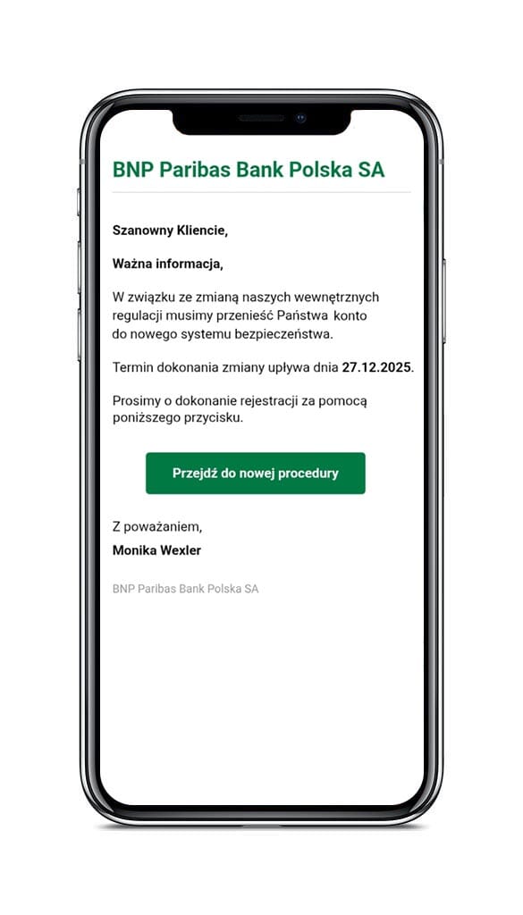 - pamiętaj, że Bank BNP Paribas nigdy nie wysyła do swoich Klientów wiadomości e-mail, w których prosi, aby przenieść swoje dane.