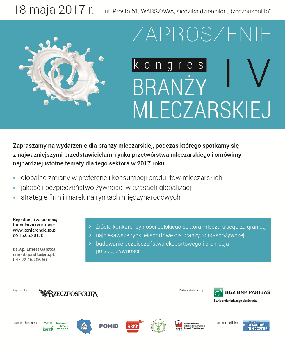 Czwarta edycja KONGRESU BRANŻY MLECZARSKIEJ stanowi kontynuacją idei spotkań biznesowych dla branży mleczarskiej, które są płaszczyzną wielu debat i dyskusji. Kongres odbędzie się już za tydzień 18.05.2017 w siedzibie „Dziennika Rzeczpospolita” ul. Prosta 51 w Warszawie. Bank BGŻ BNP Paribas jest Partnerem Strategicznym Kongresu. Zapraszamy zainteresowanych.
