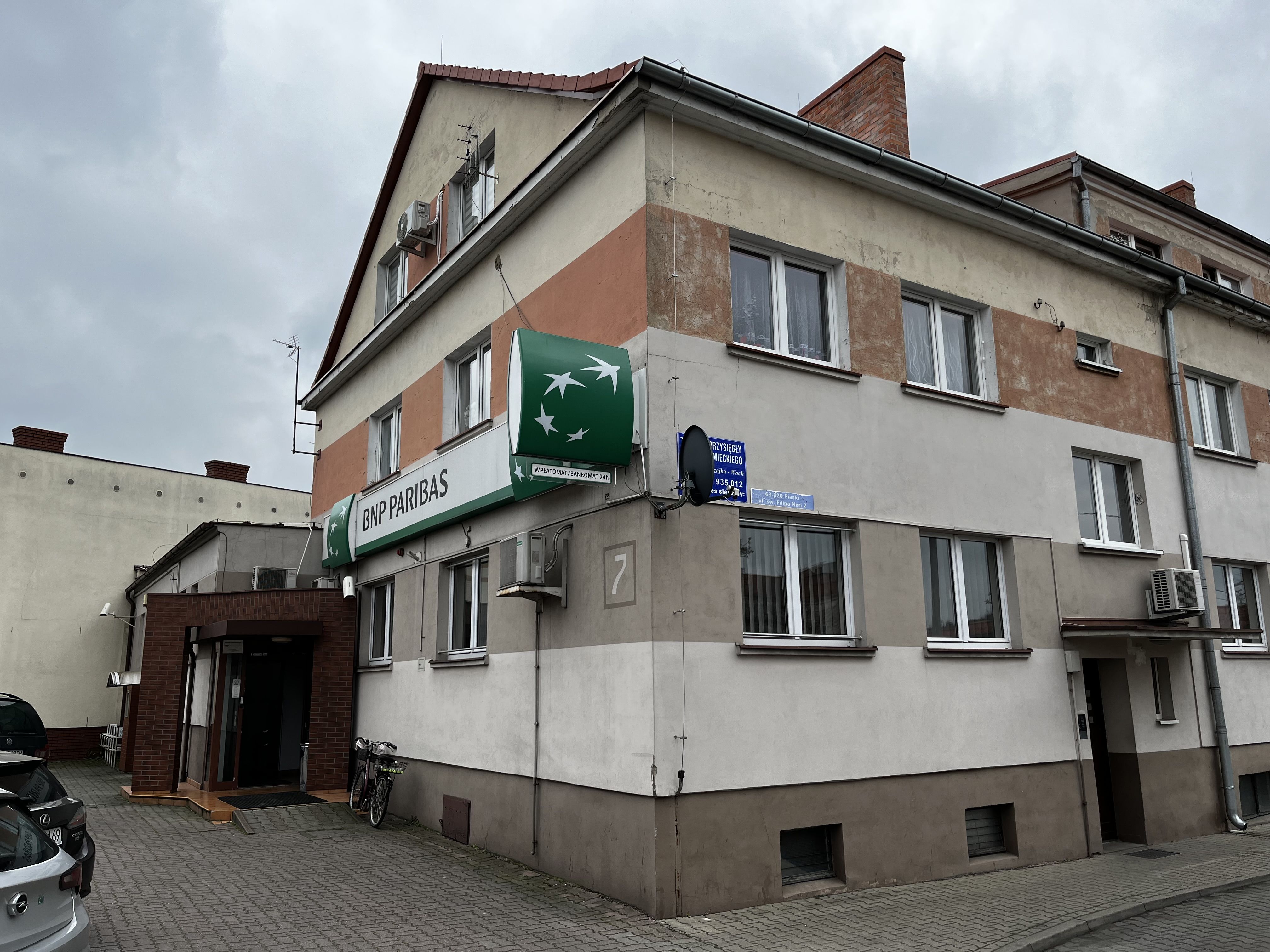 Budynek biurowy, jednopiętrowy, wybudowany w 1960 roku. W późniejszych latach obiekt remontowany i dostosowany do funkcji biurowo-usługowej placówki banku, obiekt po termomodernizacji. Połączony z Lokalem znajdującym się w sąsiednim budynku.