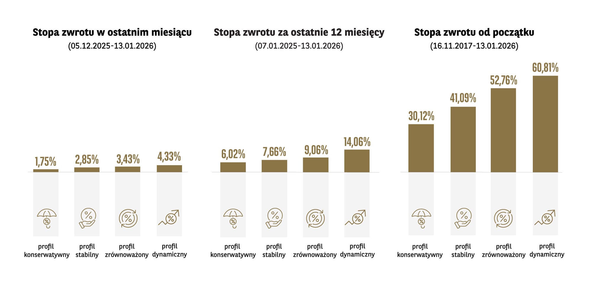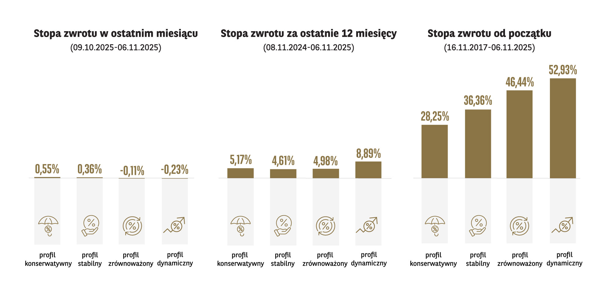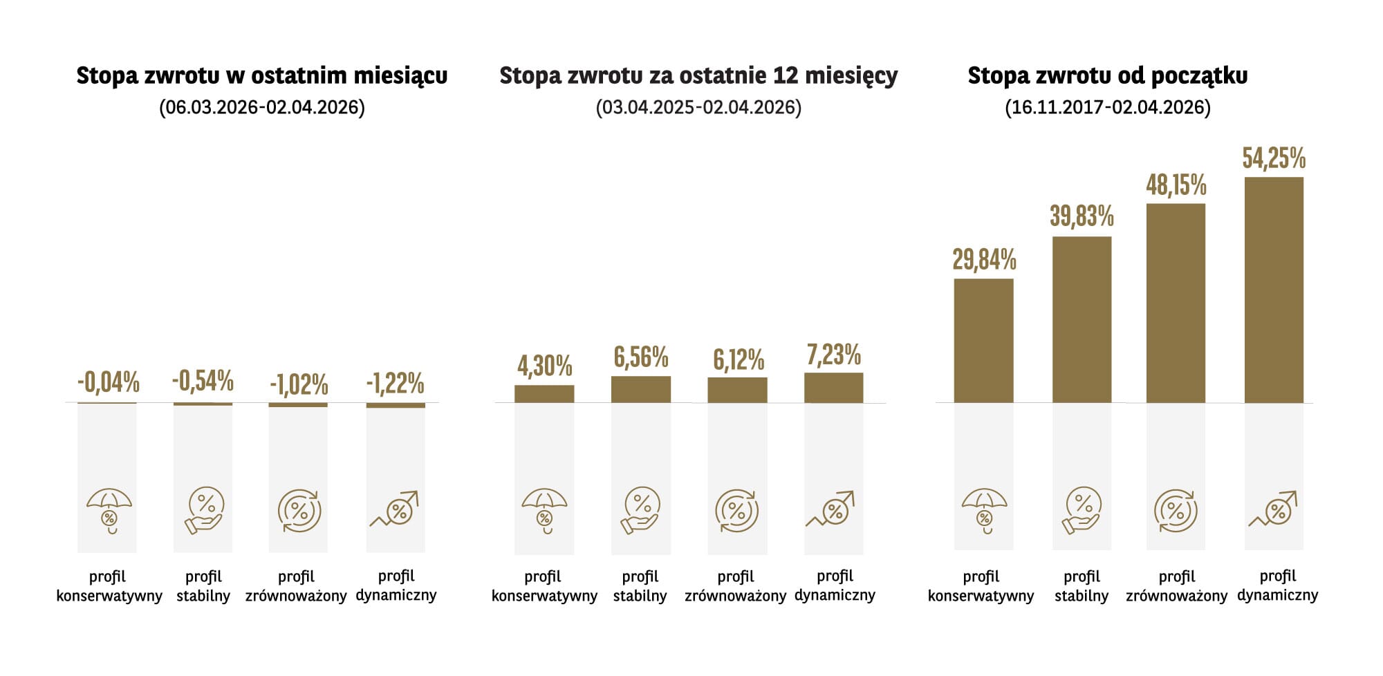Prezentowane stopy zwrotu nie uwzględniają opłat, prowizji ani podatków obciążających dochód z inwestycji. Prezentowane dane przedstawiają stopy zwrotu poszczególnych portfeli modelowych, historycznymi odnoszą się do przeszłości. Wyniki w przeszłości nie stanowią pewnego wskaźnika na przyszłość.